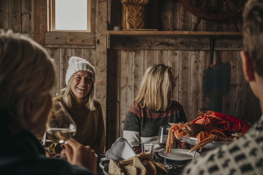 Hva med et annerledes måltid i Krabbenaustet på Flatflesa Fyr? Her starter opplevelsen allerede på båtturen ut fra Finnøy eller Småge. Kanskje har vertskapet satt ut teiner, slik at dere kan trekke opp dagens fangst sammen. Innleide kokker og vertskap står for tilberedning, oppdekking og servering i naustet. Langbord med kandelabre, saueskinn, levende lys og fyr på ovnen gir varme omgivelser, mens bølgene ruller rett utenfor naustdørene. Ønskes annen meny, tilrettelegger vi gjerne.